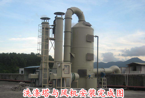 所需處理的廢氣由管道進(jìn)入洗滌塔底部,與塔壁接觸后往上升,與噴淋裝置噴出的洗滌液發(fā)生中和反應(yīng),HX+NaOH=NaX+H2O。經(jīng)過(guò)層層處理的廢氣達(dá)到洗滌塔頂部的除霧層除去氣體中含有的水氣,然后經(jīng)由玻璃鋼離心風(fēng)機(jī)排至大氣環(huán)境中。